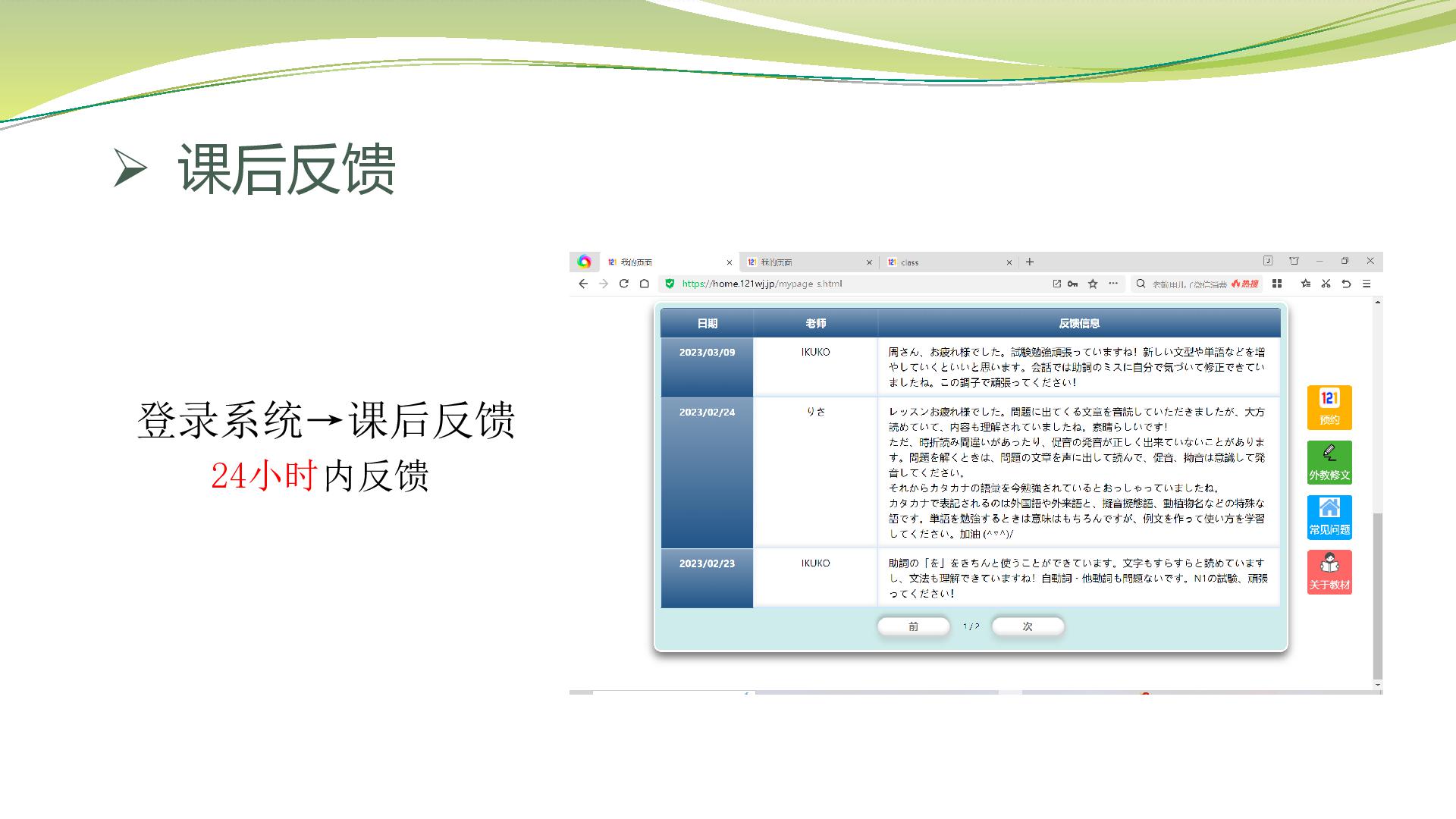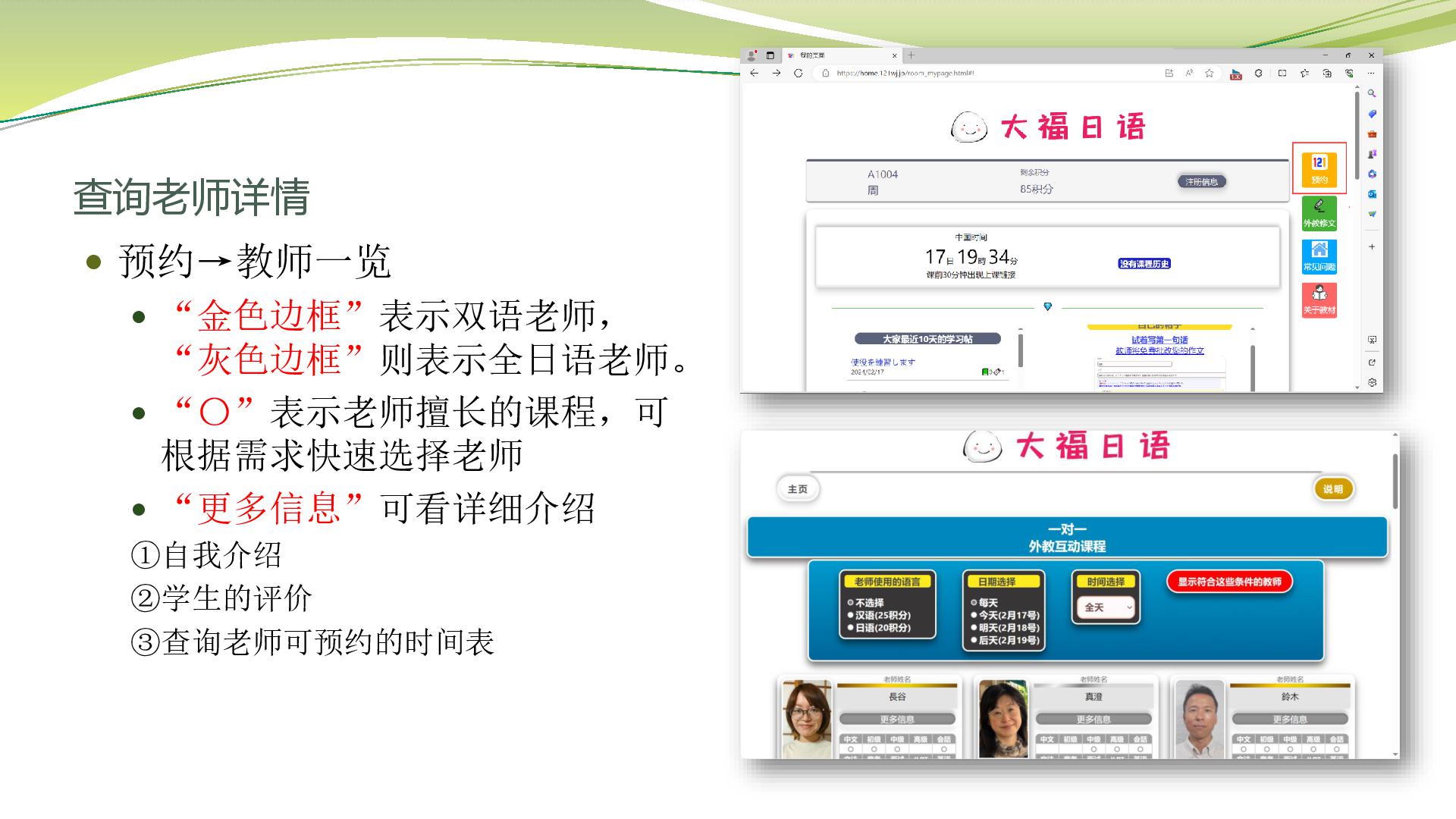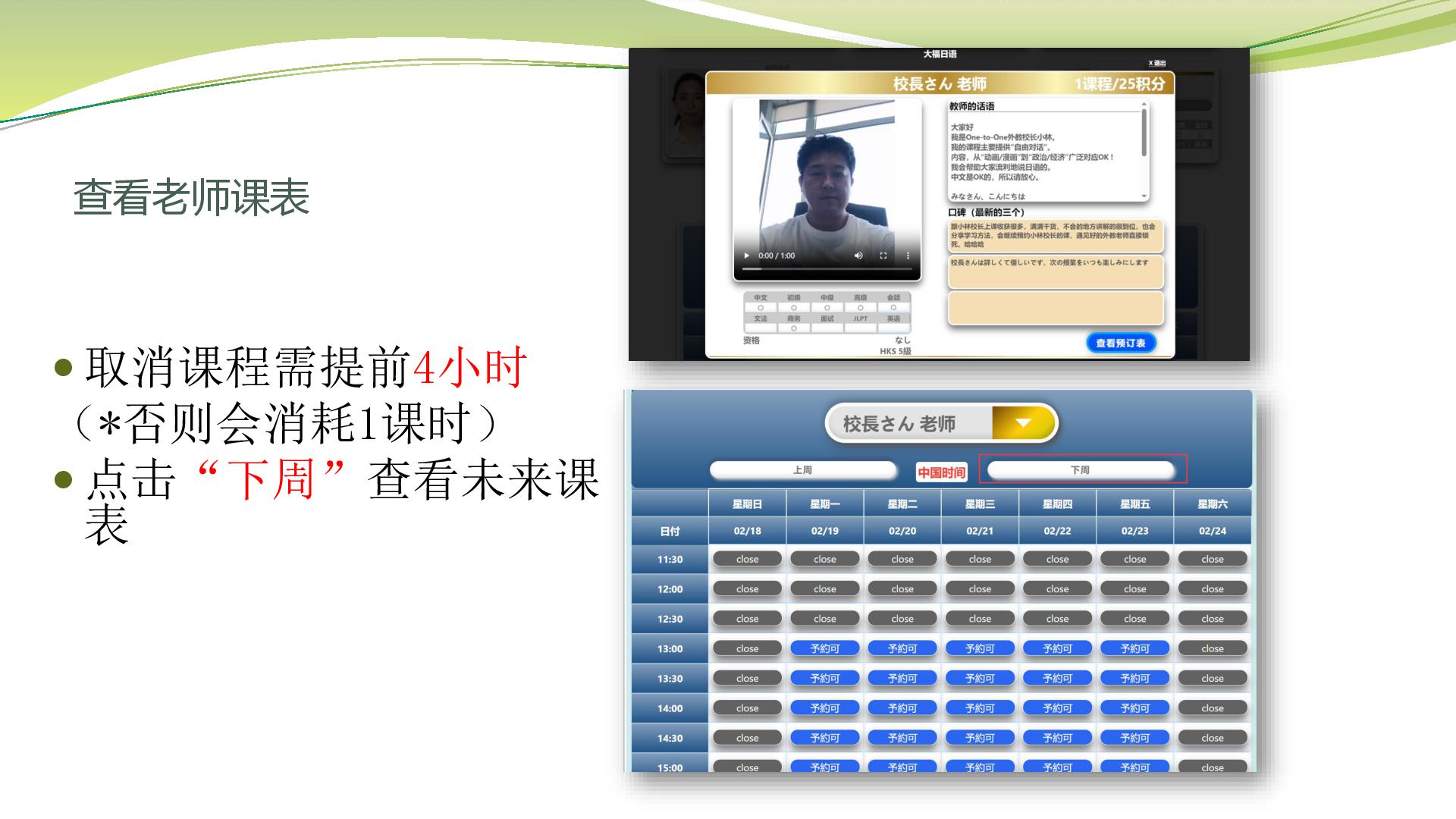 试听课老师测试同学的日语水平,和学习建议,可以准备本子和笔记录。(外教会让同学自我介绍,确认学习目的,学习要求,教材等)