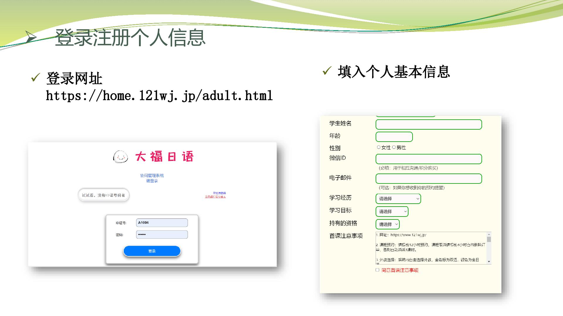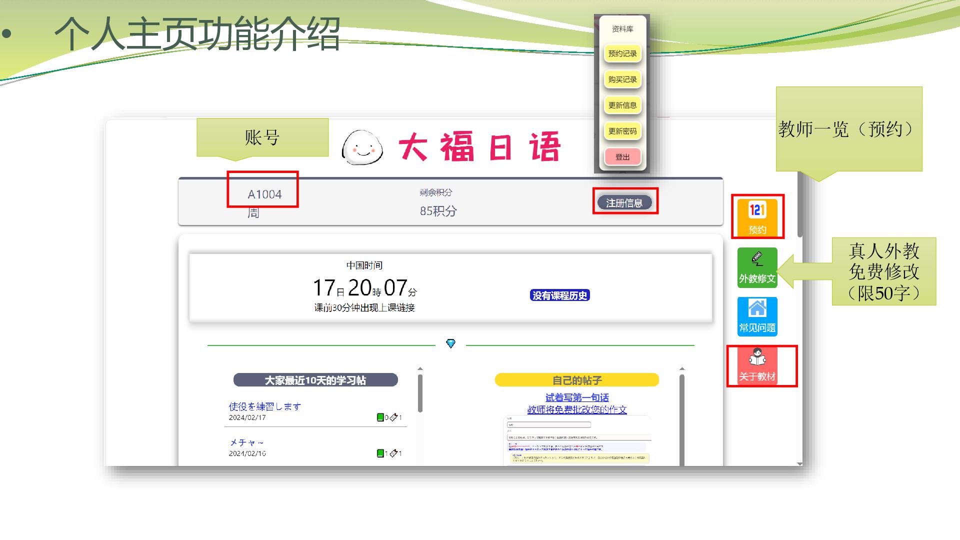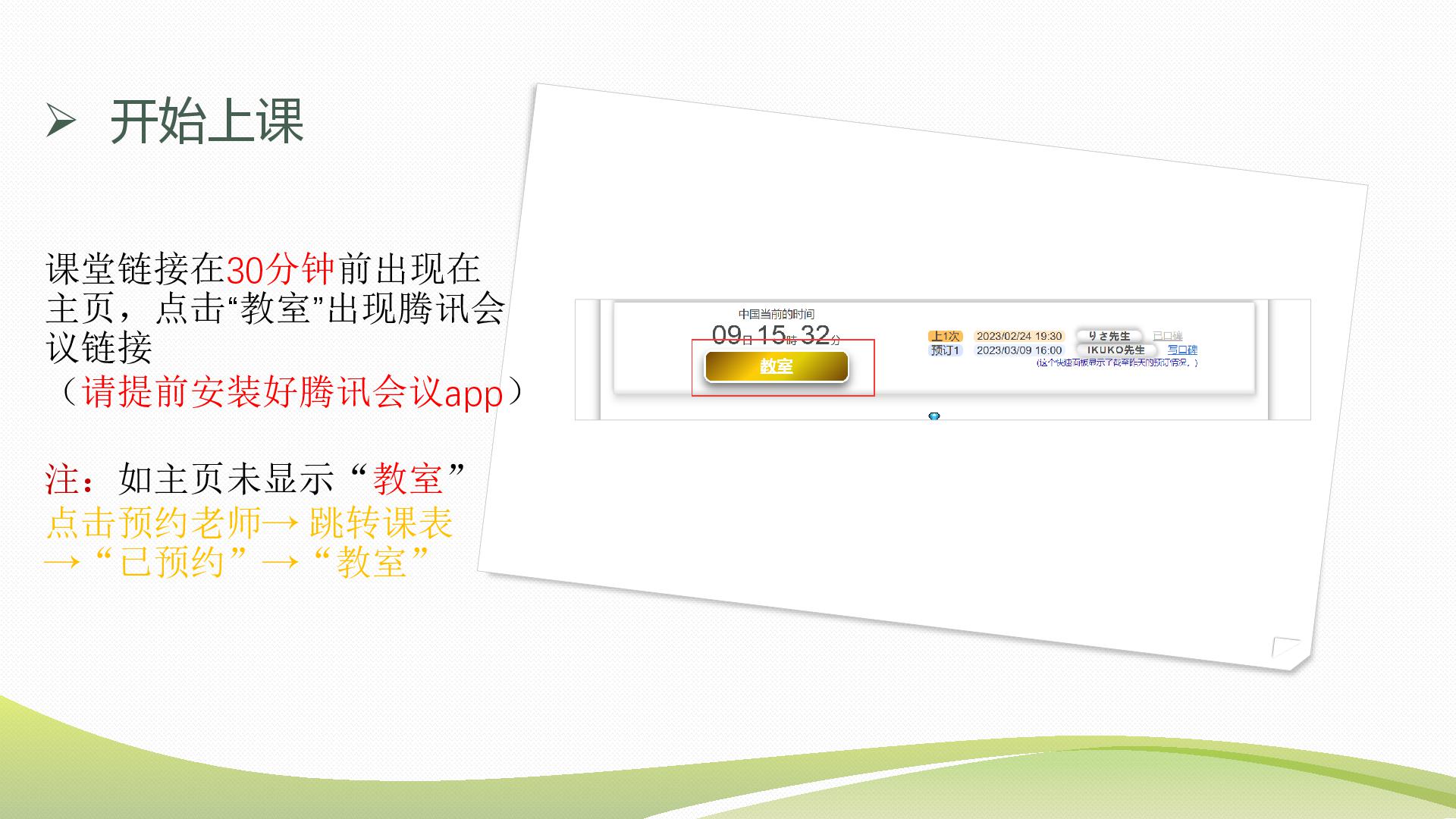 试听课老师测试同学的日语水平,和学习建议,可以准备本子和笔记录。(外教会让同学自我介绍,确认学习目的,学习要求,教材等)