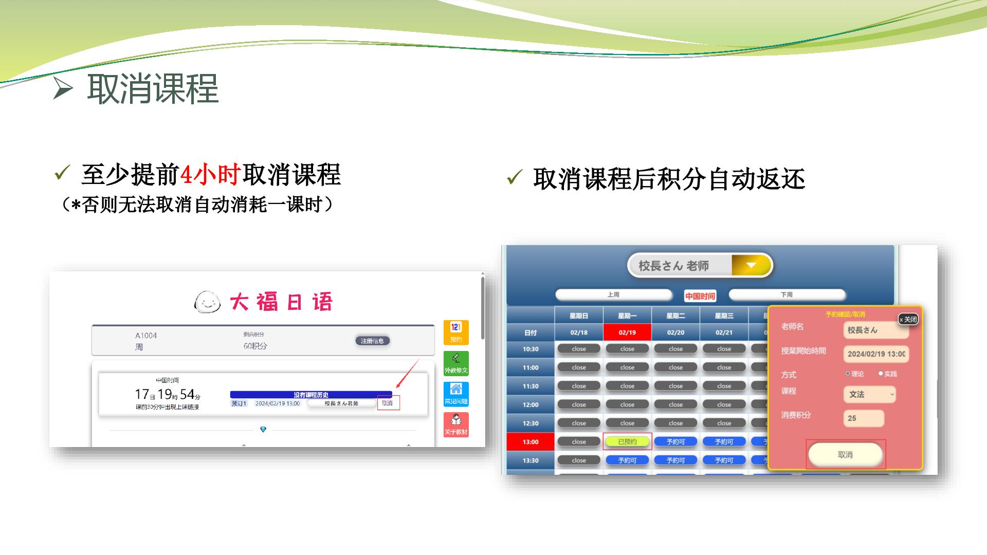 4小时以上,取消课程也需要提前4小时以上。
